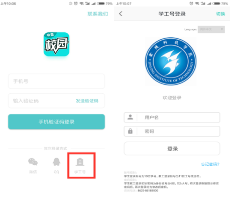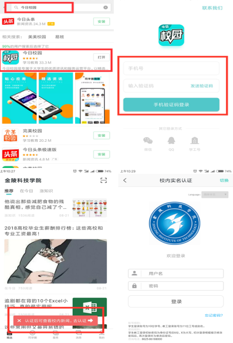 打开应用商店,搜索“今日校园”,下载今日校园APP,进入登录界面,有多种登录方式,具体如下: