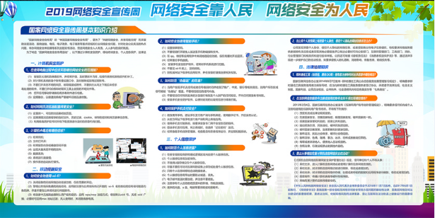 习近平总书记指出,国家网络安全工作要坚持网络安全为人民、网络安全靠人民,保障个人信息安全,维护公民在网络空间的合法权益。要坚持网络安全教育、技术、产业融合发展,形成人才培养、技术创新、产业发展的良性生态。要坚持促进发展和依法管理相统一,既大力培育人工智能、物联网、下一代通信网络等新技术新应用,又积极利用法律法规和标准规范引导新技术应用。要坚持安全可控和开放创新并重,立足于开放环境维护网络安全,加强国际交流合作,提升广大人民群众在网络空间的获得感、幸福感、安全感。下图是2019年网络安全宣传的相关介绍,广大师生可重点了解。