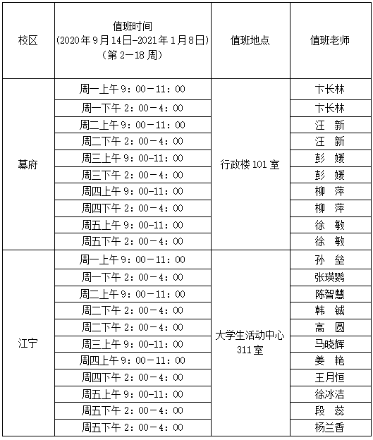 1.心理咨询预约电话:86188711;江宁校区预约地址:大学生活动中心310办公室(心理健康教育中心)。