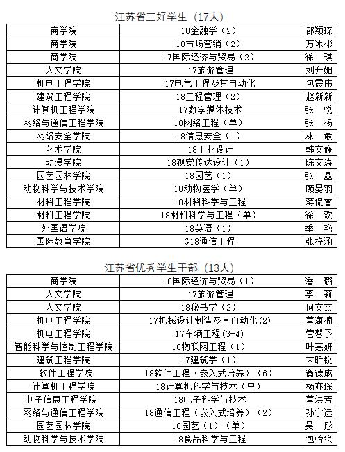 根据《省教育厅团省委关于评选2021年度江苏省普通高校省级三好学生、优秀学生干部、优秀毕业生和先进班集体的通知》(苏教学函〔2021〕5号)文件的要求,经各学院推荐,学生工作委员会评选,拟决定推荐19财务管理等11个班级为省级先进班集体,邵颖琛等30名学生为省三好学生和优秀学生干部,现将名单公示如下。