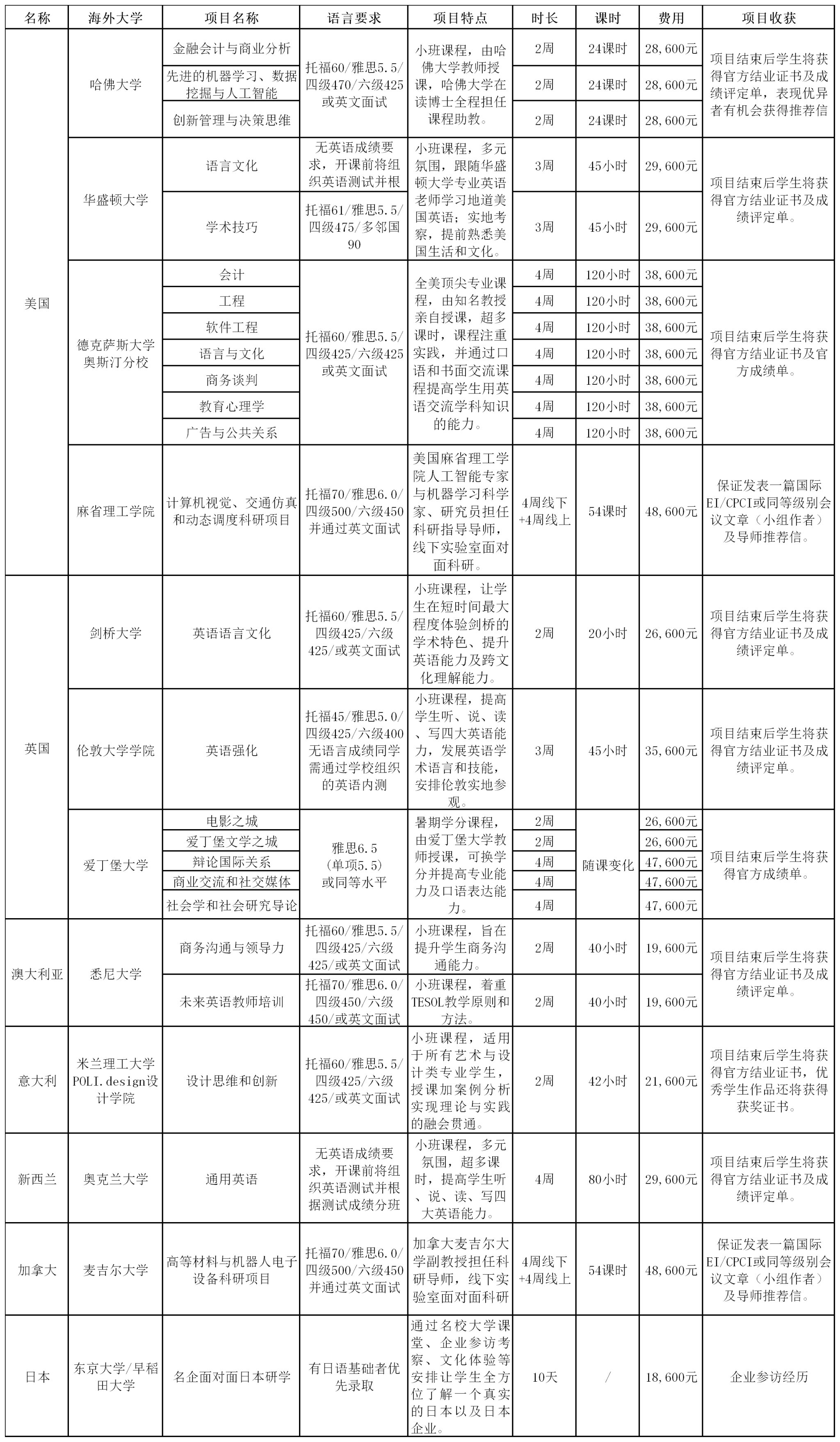 2.课程均为全英文授课,语言要求见以上表格内容。
