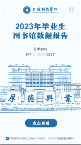 在毕业季来临之际,图书馆为每个毕业生准备了一份数据报告,提供他们在校期间图书馆里的学习轨迹、阅读清单,为大学的求学时光做个记录。也祝愿毕业生们不管是继续求学深造还是步入社会,都能脚步铿锵,前程顺利。