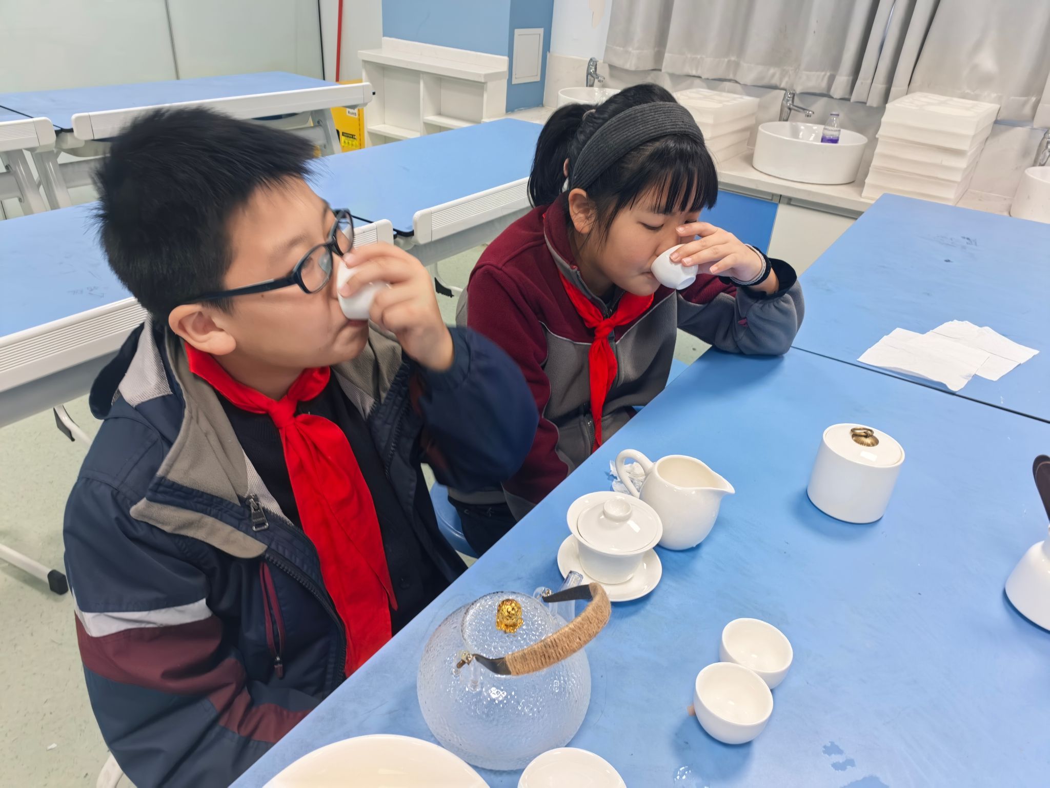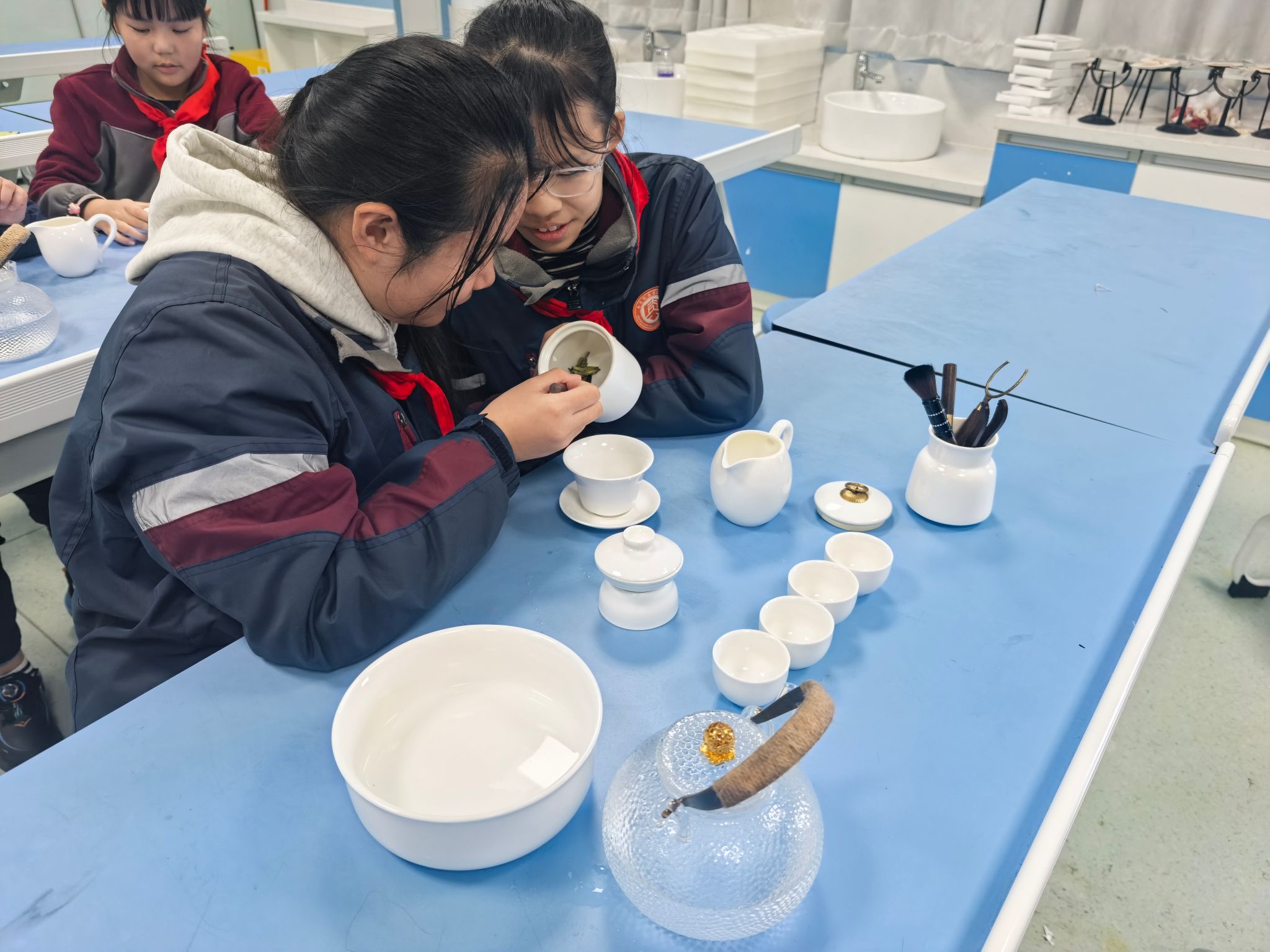 动手实践环节,孩子们分组实操盖碗冲泡,在志愿者的实时指导下调整注水角度与出汤速度。大家牢记“七分茶三分情”的礼仪,将茶汤倒至七分满,避免“茶满送客”的误区,课堂上茶香氤氲、秩序井然。从生疏试探到流畅操作,孩子们在实践中体会茶艺乐趣,成就感满满。