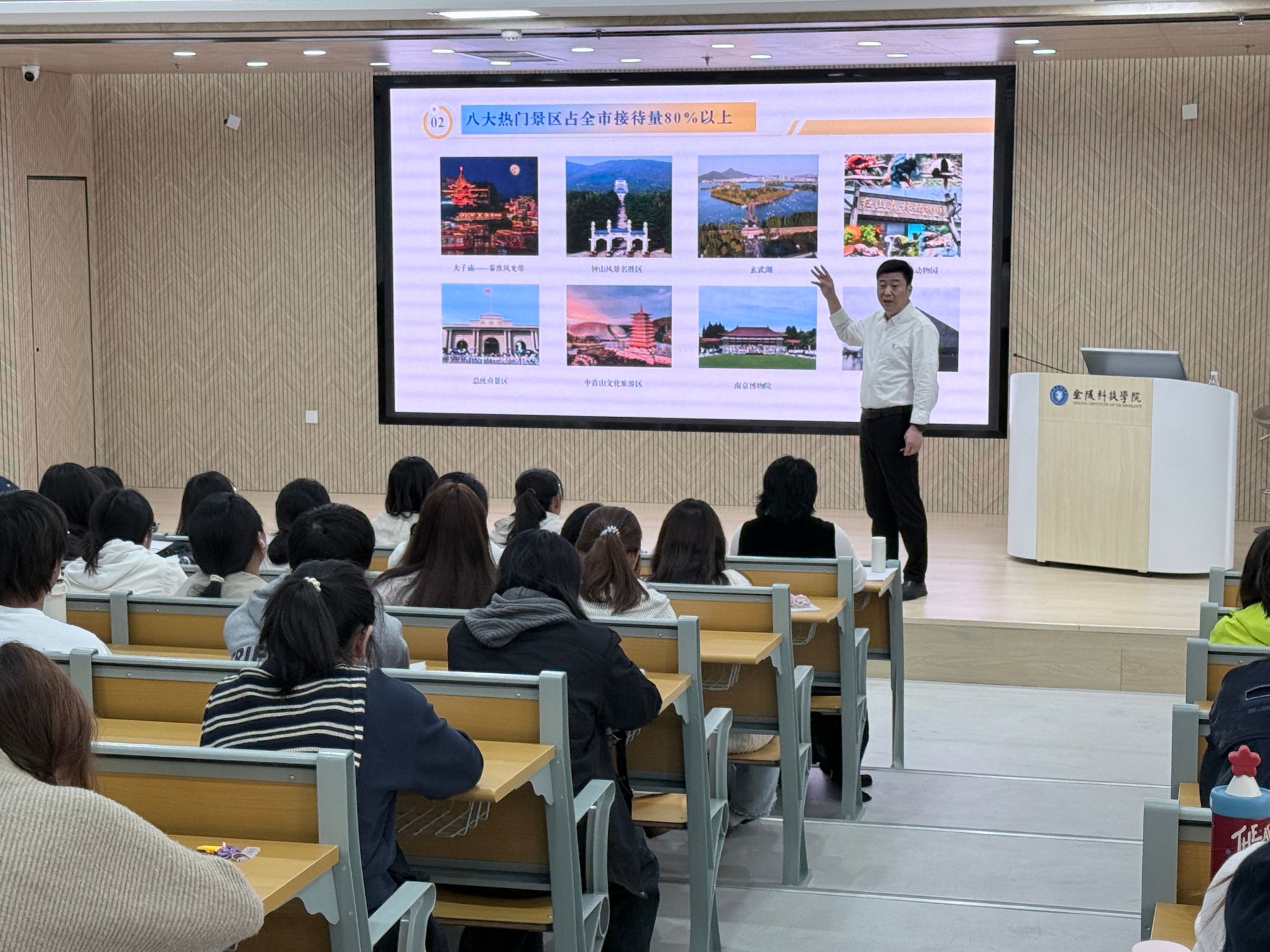 楼钱良处长以“文旅市场管理管什么”为切入点,系统梳理了文旅市场监管的核心职责。他强调,文旅市场管理需兼顾“安全底线”与“服务高线”,为学生构建了“管理即服务”的行业认知框架。接着,他围绕“南京文旅到底有多火”,以详实的数据与案例向师生们展现了南京文旅的强劲活力。2023年和2024年,南京全年接待游客量连续两年突破2亿人次,夫子庙、牛首山等景区跻身“全国文旅网红打卡地TOP10”。“苏超赛事到底有多牛?”楼处长剖析了体育赛事对城市文旅的拉动效应。他指出,苏超的成功在于精准定位“体育IP+城市名片”,实现了“以赛促旅、以旅兴城”的良性循环。