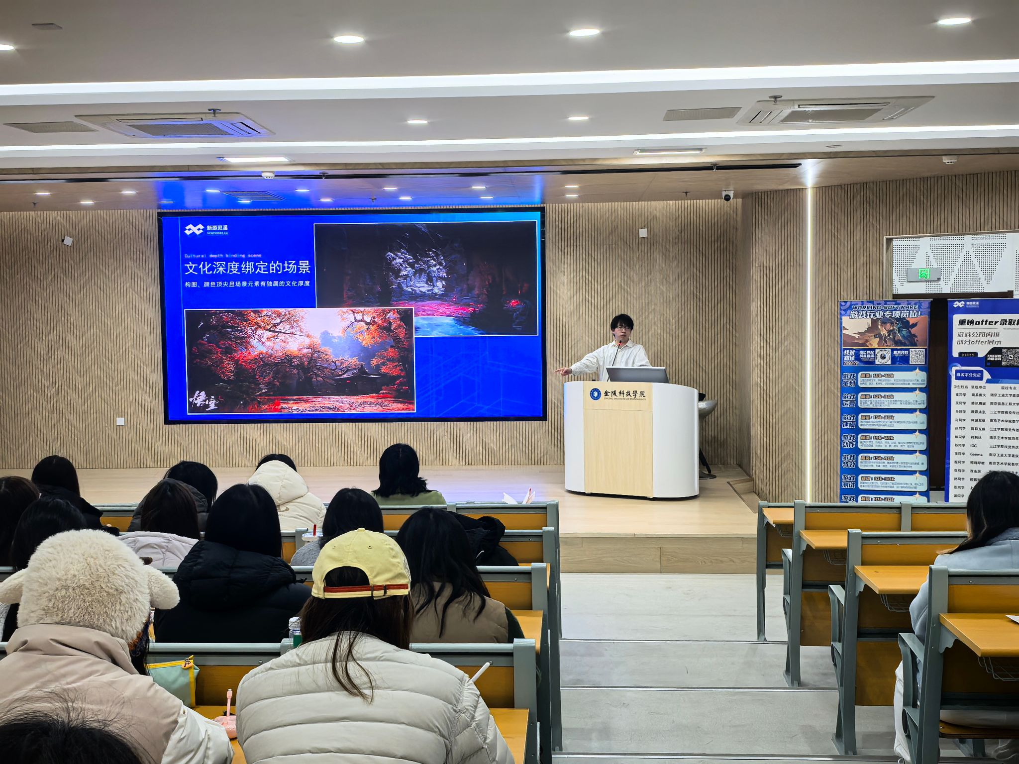 讲座邀请了原米哈游(原神项目组)资深设计师、游戏教育行业专家陈旭担任主讲。陈老师凭借在顶尖游戏公司的深厚从业背景和丰富的求职指导经验,为在场同学带来了一场信息密集、实用性强的行业入门指导。