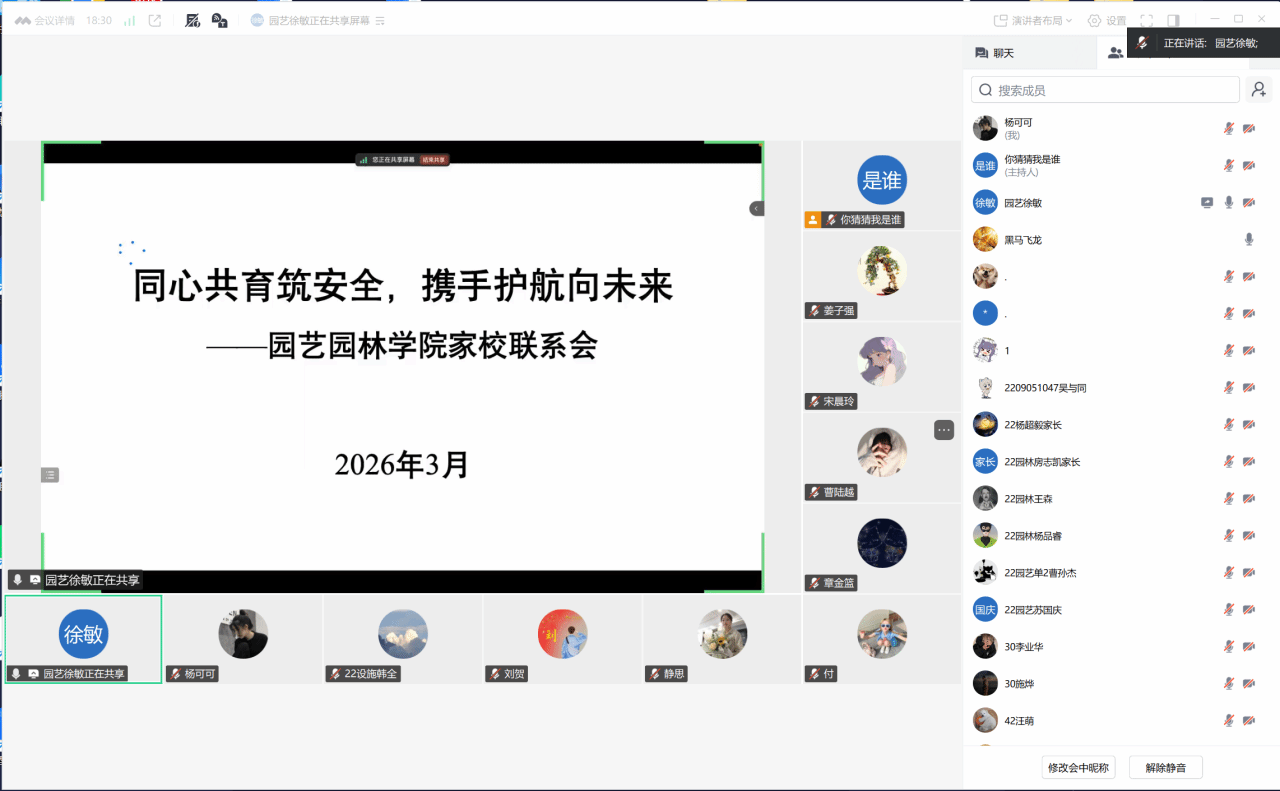 近日,园艺园林学院各年级辅导员分别召开大学生线上安全教育家校沟通会,覆盖全体学生家长,聚焦大学生线上诈骗预防、心理状态调适、学业困难破解三大核心议题。辅导员结合大学生常见的网络诈骗案例(如校园贷、虚假兼职、学术诈骗等)讲解防范要点,公布心理帮扶渠道,分析不同年级学生学业痛点并提出家校协同帮扶建议。活动有效凝聚家校育人合力,筑牢大学生线上成长安全屏障。