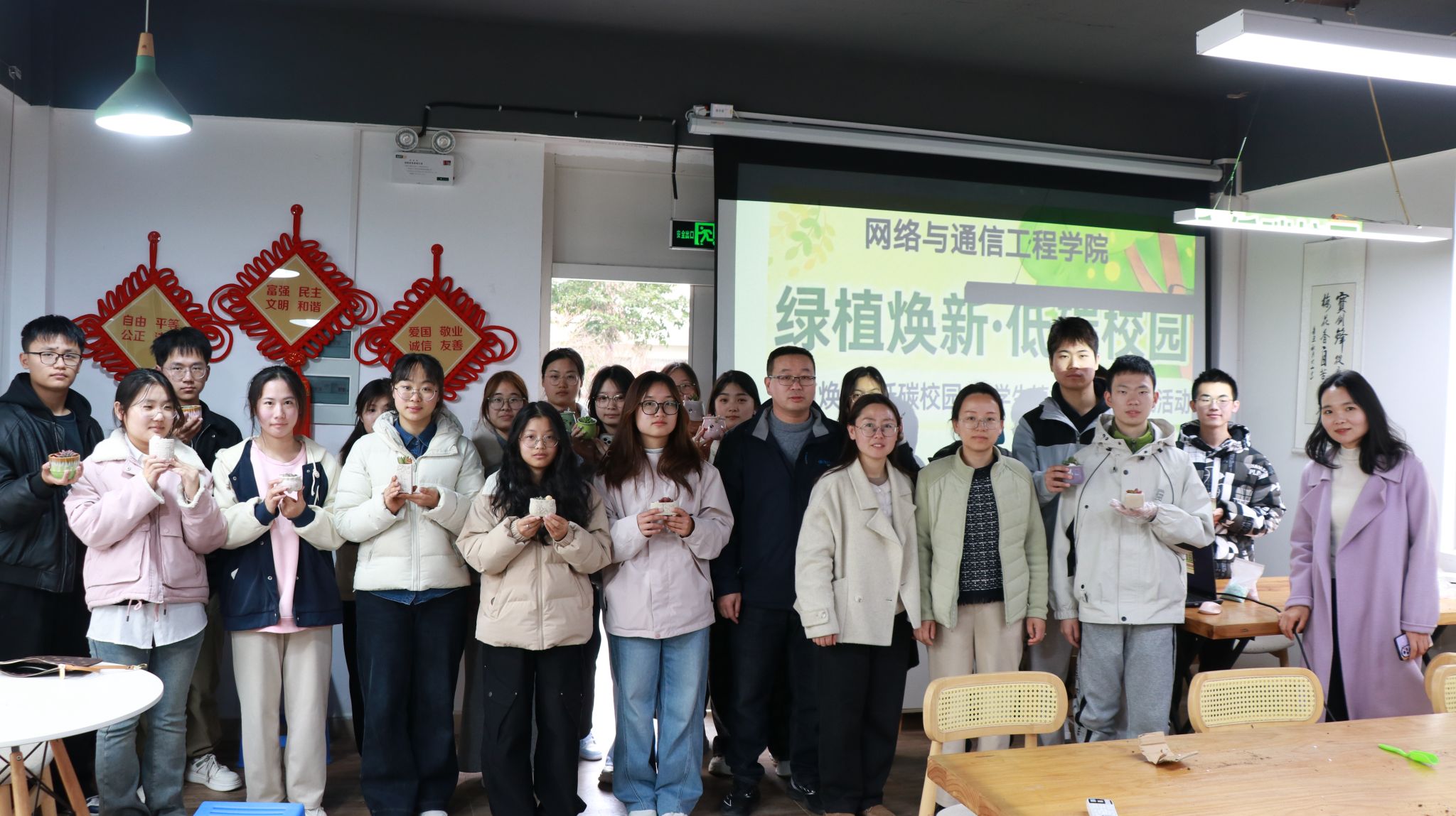 为迎接第46个植树节,厚植大学生绿色环保理念,引导青年学子践行低碳生活方式,3月11日下午,网络与通信工程学院于北04一站式社区开展“绿植焕新·低碳校园”多肉盆栽DIY活动,让同学们在手工创作中邂逅自然之美,以实际行动助力绿色校园建设。
