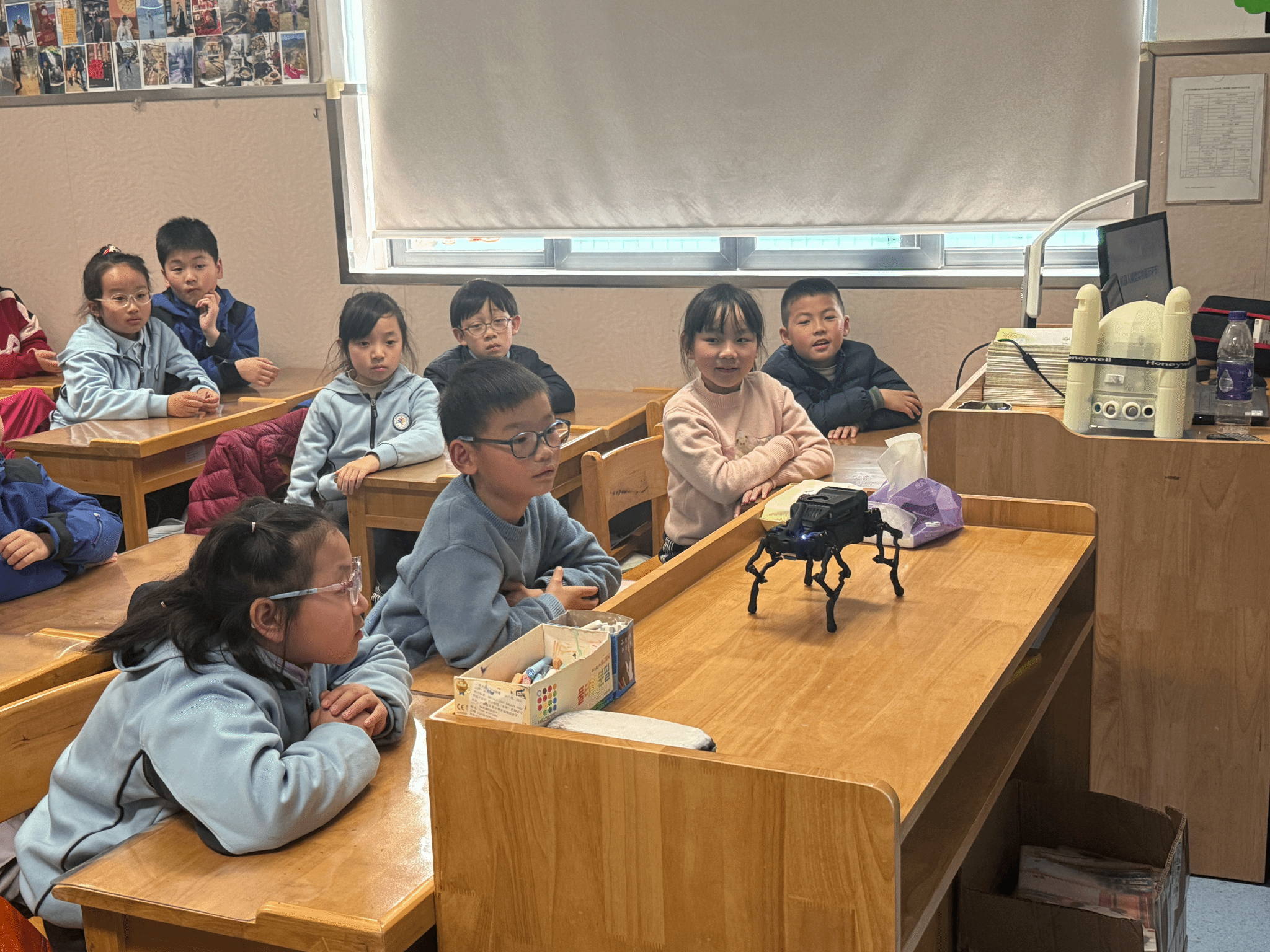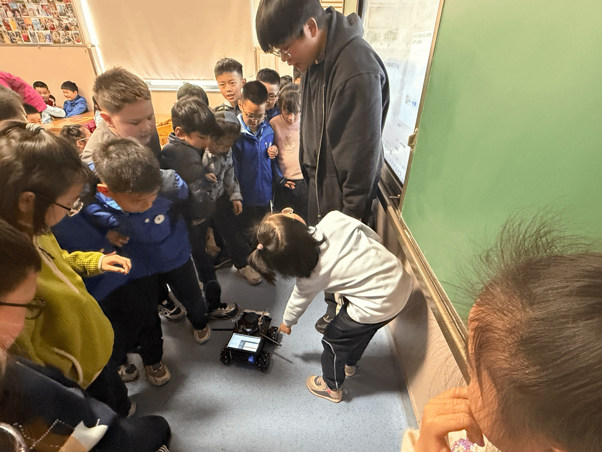 活动现场,科创团队学生以趣味科普为切入点,通过可灵活移动、兼具可滚可爬可飞多种功能的无人机机器人、仿生手、仿生脸、宇数机器人等模型,结合团队参赛实战经历,用通俗易懂的语言讲解机械构造与运行原理,把抽象的科技知识变得直观生动,迅速点燃了孩子们的好奇心与探索欲。随后,微雪电子狗、ROS智能养老服务机器人轮番登场,动态演示、互动操作、现场答疑等环节精彩纷呈。在团队成员的耐心指导下,小学生们踊跃参与、积极互动,沉浸式感受科技的独特魅力,在亲身体验中感知科学奥秘,创新思维的种子悄然种下。
