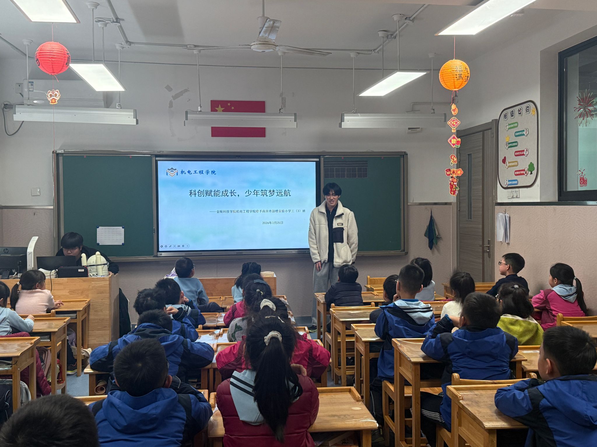 为厚植青少年科学素养,点燃科技创新梦想,3月25日下午,机电工程学院学工办李梅老师带领CR科创团队成员走进鼓楼实验小学,举办“科创进校园”系列活动,学生科创团队负责人王玉鹏、赵宇龙为孩子们送上一堂生动有趣的科普实践课。