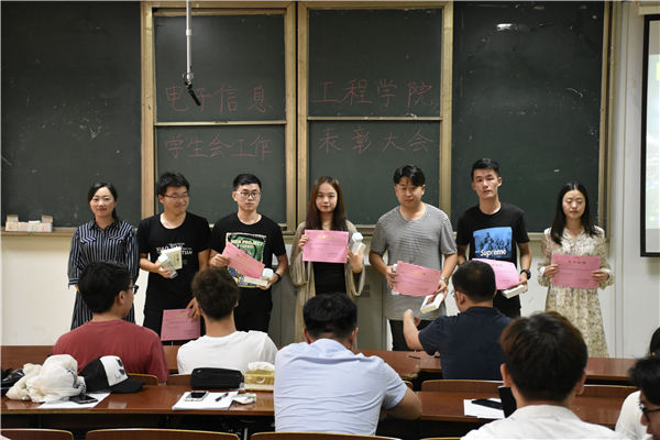 为了表彰先进集体与个人,为学院其他同学树立榜样,激励后进,起到共同提高的作用,电子信息工程学院于2018年6月28日晚19:00在1232教室举办了本学期学生工作表彰大会暨社联工作表彰会。参加大会的有辅导员吴丹、李岩,电信学院第五、第六届团总支学生会、社联全体成员,17级各班学生代表以及受表彰的个人。