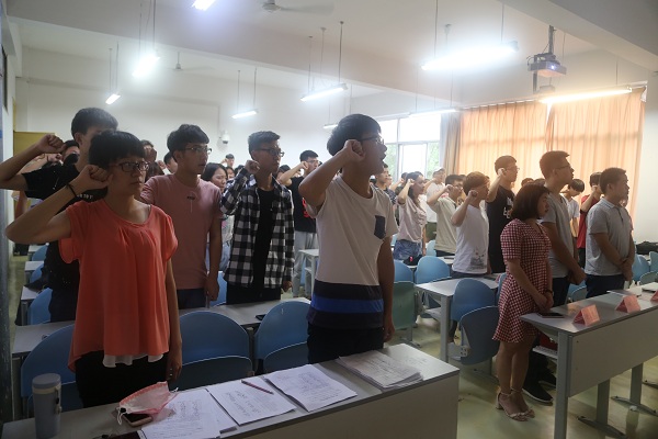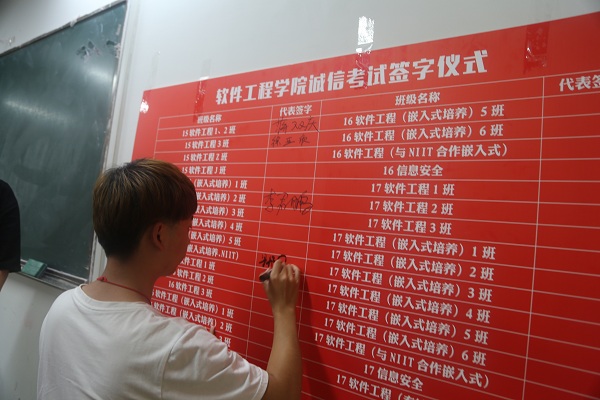 大会伊始,学习部部长张娜上台发言。她从何为学风、学风建设的目标两个方面对学风建设工作进行了简要的介绍,并鼓励大家为良好学风的建设出一份力。紧接着学生代表尹艺璇带领全体学生宣誓,全体学生起立并举起右手,庄重地喊出自己的诚信考试誓言。随后,15级、16级及17级各班班长或学委代表本班级在“软件工程学院诚信考试签字表”上签字。最后,14级辅导员李勇带着同学们学习了《kaiyun登录中国入口登录学生纪律处分规定》第三章第二十三条内容和《kaiyun登录中国入口登录学士学位授予工作实施细则》内容(详见《学生指南》),让学生认识考试违规作弊的严重后果,增强学生自律意识,消除学生侥幸心理,引导学生认真备考,诚信考试。