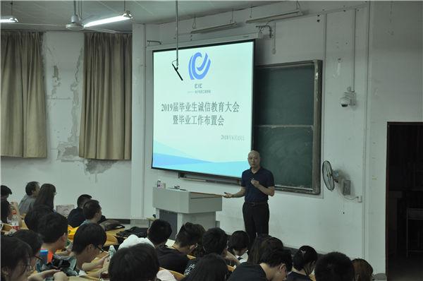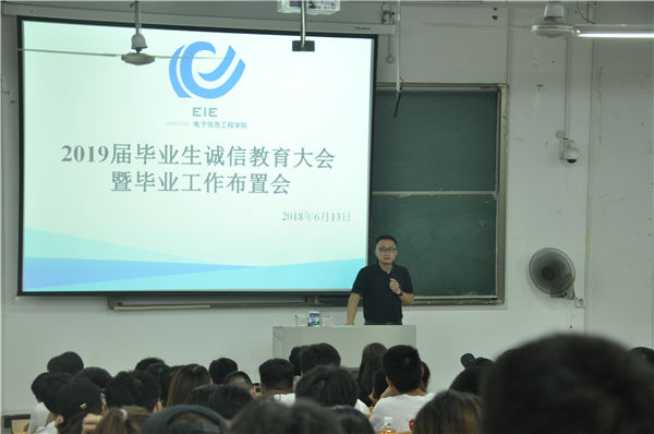 为加强诚信考试教育,营造良好学习氛围,进一步推进学院学风建设,帮助2019届毕业生尽早明确毕业选择方向,做好毕业准备,2018年6月13日18:30,电子信息工程学院在7300教室召开了2019届毕业生诚信教育大会暨毕业工作布置会。电信学院党总支副书记(主持工作)王正昱、(主持工作)副院长陈正宇、副院长徐志国、全体辅导员、2019届全体班主任以及2019届全体毕业生参加了此次大会,会议由辅导员吴丹主持。
