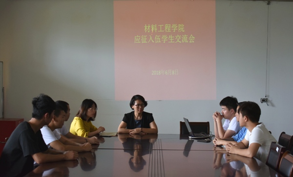 为了让应征入伍的同学们更加了解入伍的流程,坚定自己的信念,充分做好准备。2018年6月8日中午12:25,材料工程学院在工科楼会议室召开应征入伍学生交流会。材料工程学院党总支副书记陈智慧辅导员王亚男出席本次会议。