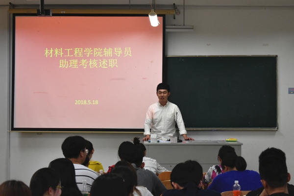 为交流经验,总结并分享辅导员助理在一年中的工作,5月18日中午12:00,材料工程学院17级辅导员助理述职大会在1202教室召开。材料工程学院党总支副书记陈智慧、学工办主任邱勤和各年级辅导员出席本次会议。