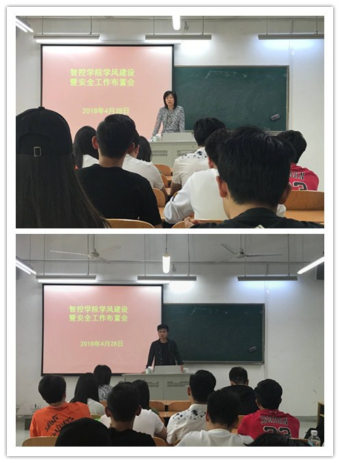 为了加强学风的建设,落实相关春季安全事宜。2018年4月29日中午12:30,智控学院在教室2209组织召开了学风建设暨安全工作会。智控学院党总支书记戴典芬,辅导员张亮参与了本次大会,团学干部及各班班长参加了会议。