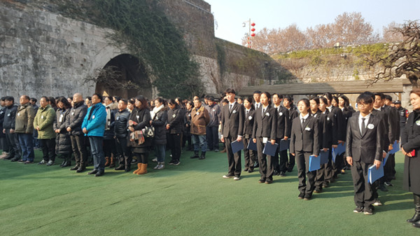12月13日早上,人文学院23名汉语国际教育专业学生,在院党委副书记周建峰,汉语国际教育系教授刘洪老师及辅导员高欢欢的带领下,来到中华门瓮城景区参加了南京城墙保护管理中心的公祭仪式。