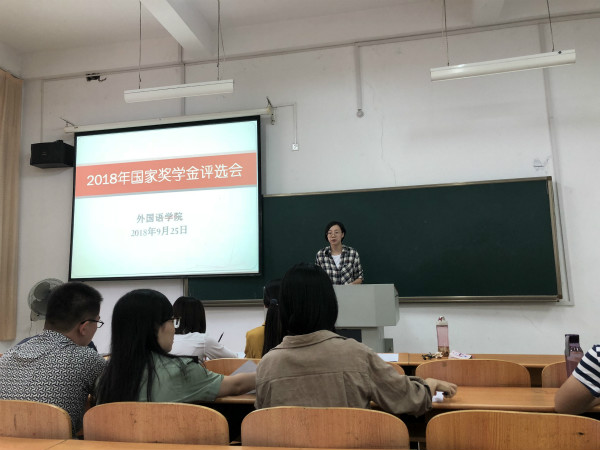 9月25日下午,外国语学院在4105教室召开了2018年国家奖学金评选会。会议由外国语学院团总支书记王奕老师主持,学院全体班主任、辅导员及部分学生代表参加了此次会议。