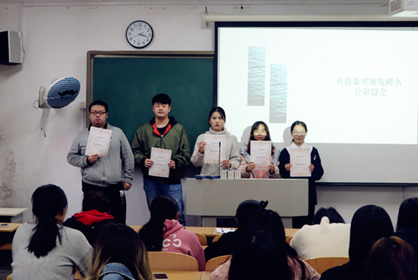 为更好地运营“金科人文在线”微信公众平台,优化运营工作团队,11月7日下午3:00在幕府校区教学楼101,人文学院举办了“金科人文在线”微信公众平台运营人员换届聘任仪式。本次活动邀请公众号负责辅导高欢欢老师,第一届运营负责人员和全体运营工作团队学生参加了仪式。