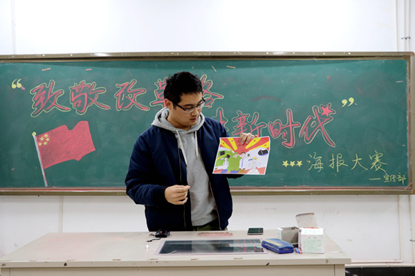 12月21日晚6:30,在图教楼B205室人文学院举办了以“致敬改革路,奋进新时代”海报设计大赛,人文学院学生会主席刘轩、宣传部部长高洁、副部长谈星,第十四届宣传部部长金士清出席了本次大赛。