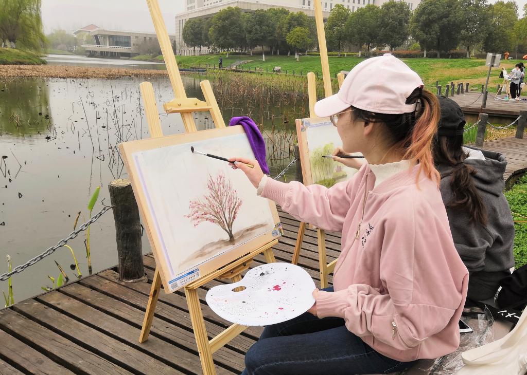 恰逢初春,柳芽随春风轻抚,蛙鸣在湖面泛漪。在春满校园的宁静氛围里,学院心理辅导站王老师为同学们讲解了色彩心理学的相关知识,告诉大家要关爱自身心理健康,善于发掘运用积极的心理色彩。同学们则以“描绘情绪”为主题进行写生作画,以丰富的色彩构图来表达出不同的情绪特点。随后,同学们以自己所描绘的情绪主题对作品进行了命名,并在活动横幅上签下了作品名称和自己姓名。