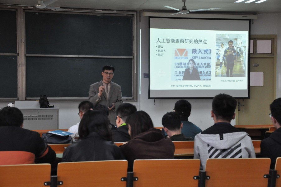 为促进本科生企业导师更好地把握学生的特点,有效提升本科生导师制实施效果,4月10日下午,电子信息工程学院在教学楼1432举办了主题为“带‘电’相关专业的就业新机遇--嵌入式人工智能”讲座,南京优奈特信息科技有限公司林新华老师主讲,16级和18级电子信息工程专业的同学参加讲座。
