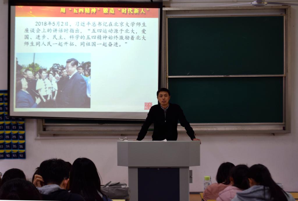 为弘扬五四精神,做新时代新青年。4月10日下午14:30,人文学院在教学楼一阶教室举办了题为“用‘五四精神’锻造‘时代新人’”的形势与政策讲座,本次讲座由我院党委副书记周建峰担任主讲人,各班级学生代表参加了讲座。