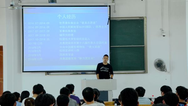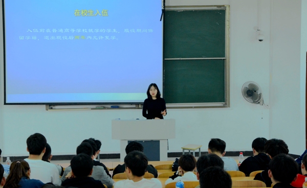 会议伊始,王亚男老师在讲话中强调,国家富强需要一支坚强的高素质的人民军队,而军队建设需要高素质的人才,她号召同学们积极响应国家号召,应征入伍,走进军队,为国防事业作贡献;随后,王老师向在场的同学们详细讲解了国家对大学生参军入伍的优惠政策。退伍学生代表李嘉恒向同学们讲述了他的个人经历、兵营生活与感悟。他谈到,参军不仅学到了知识,锻炼了意志,磨砺了性格,使自己的生活更充实、思想更成熟、信念更坚定。他表示,报效国家,此生无悔,号召大家积极响应国家号召,携笔从戎,建功军营。