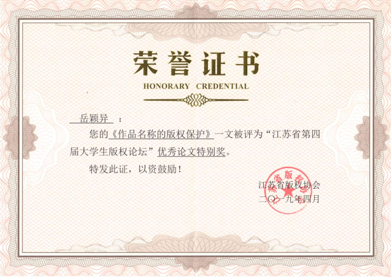 2018年,江苏省版权协会以新时代发展为主题,聚焦新媒体面对的版权热点问题,成功举办了江苏省大学生版权征文评选活动和“江苏省第四届大学生版权”。征文工作组委会收到来自江苏省和江苏籍大学生关于版权的论文三百余篇。经过专家初审、答辩复评和模拟演讲等程序,评定20篇论文入围,并推选其中8篇为江苏省第四届大学生版权论坛演讲论文。我院16级行政管理专业学生岳颖异成功入围。2018年10月21日,岳颖异同学在苏州国际博览中心演讲了她的论文《作品名称的版权保护》,展现了人文学子自主学习、刻苦钻研的精神风貌,取得了“优秀论文特别奖”的好成绩。因kaiyun官网在该活动中成绩图书,被予以了“最佳组织奖”的表彰。