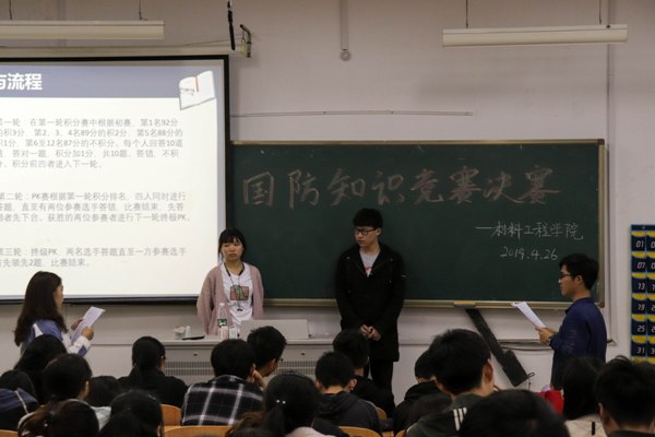 为加强国防教育,增强大学生的国防观念,材料工程学院在2019年4月29日举办了国防知识竞赛,材料工程学院辅导员王亚男老师现场指导。