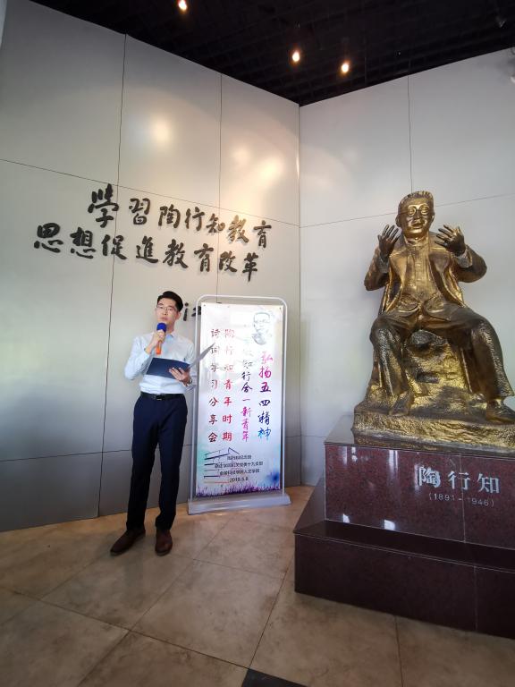 值此五四运动100周年之际,为弘扬五四精神,纪念“五四”新文化运动中,用平民教育为“中国教育寻觅新的曙光”的中国教育改造旗手,伟大的人民教育家陶行知先生。5月8日下午15:00,人文学院联合陶行知纪念馆、晓庄学院机关党委十九支部,迈皋桥街道晓庄社区团支部,在陶行知纪念馆大厅举办了陶行知青年时期诗词学习分享会。陶行知纪念馆副馆长马仕锦、第十九支部党员代表,迈皋桥街道晓庄社区团支部代表,人文学院党委副书记周建峰,团总支书记童明明和副书记高欢欢出席了活动。人文学院劳山下读书会代表、团干部代表、团员代表等30人参加了分享会。