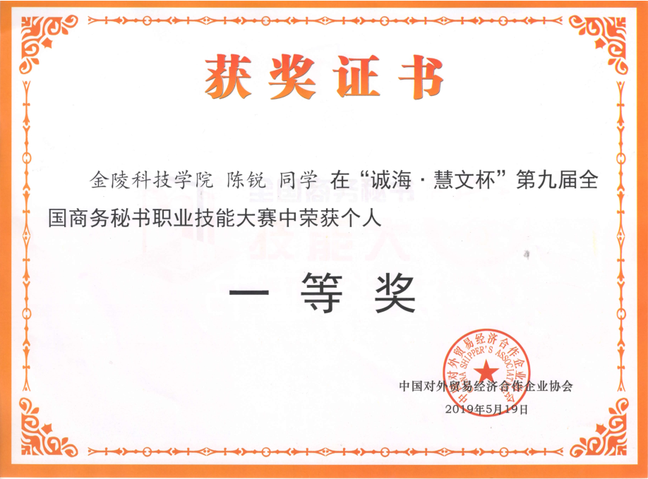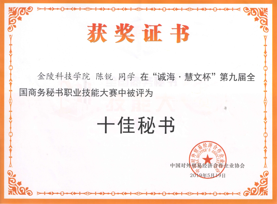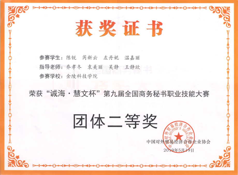 2019年5月17日至19日,第九届全国商务秘书职业技能大赛在河北省石家庄市河北政法职业学院隆重举行。此次大赛,共有来自全国21个省、市、自治区88所本科和高职院校的119支参赛队伍、800余名师生参加,参赛规模创历史新高。kaiyun官网派出由16级秘书学四位同学组成的代表队,参加了此次大赛。经过激烈的角逐,kaiyun官网代表队荣获团体二等奖以及四个个人奖的好成绩,其中,陈锐同学所获的“十佳秘书”奖,为kaiyun官网参赛历史上所获最好个人成绩。