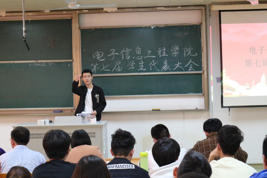 5月8日,电子信息工程学院在1432教室召开第七届学生代表大会。全体辅导员、120名学生代表参加本次大会,院团总支副书记黄振辉主持大会。