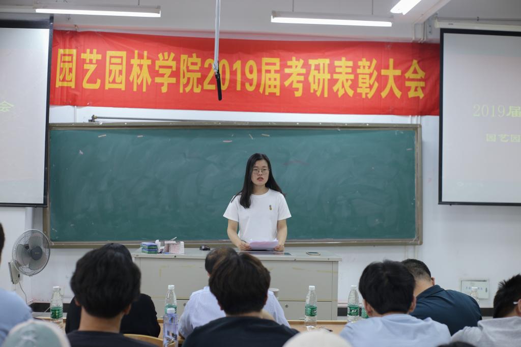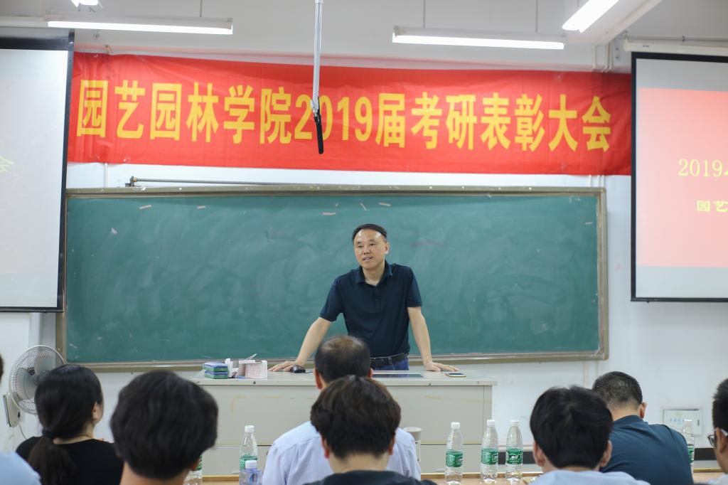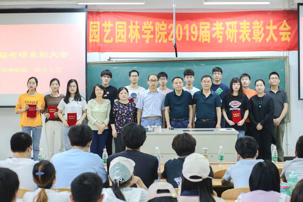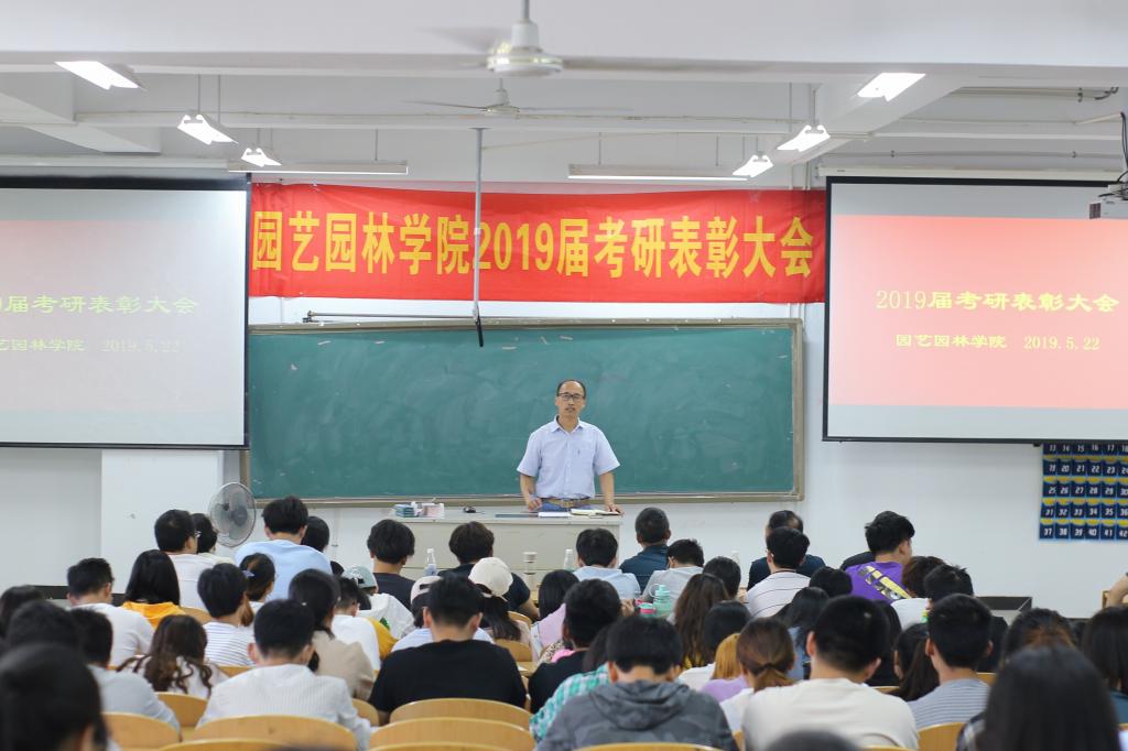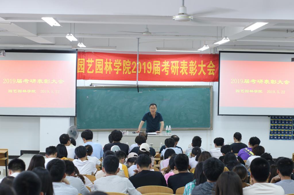 2019届考研结果尘埃落定,我院考研学子喜讯频传,考研录取人数再创新高,共有60名学生考取硕士研究生。5月22日下午,园艺园林学院在图教楼B205隆重举办2019届考研表彰大会。院党委书记陈玉林,院党委副书记、院长宰学明,教师代表王长义,学工办甘黎明、徐敏、王淼老师,2019届考研录取学生,以及2016级、2017级、2018级学生代表近200人参加本次大会,会议由卞长林老师主持。