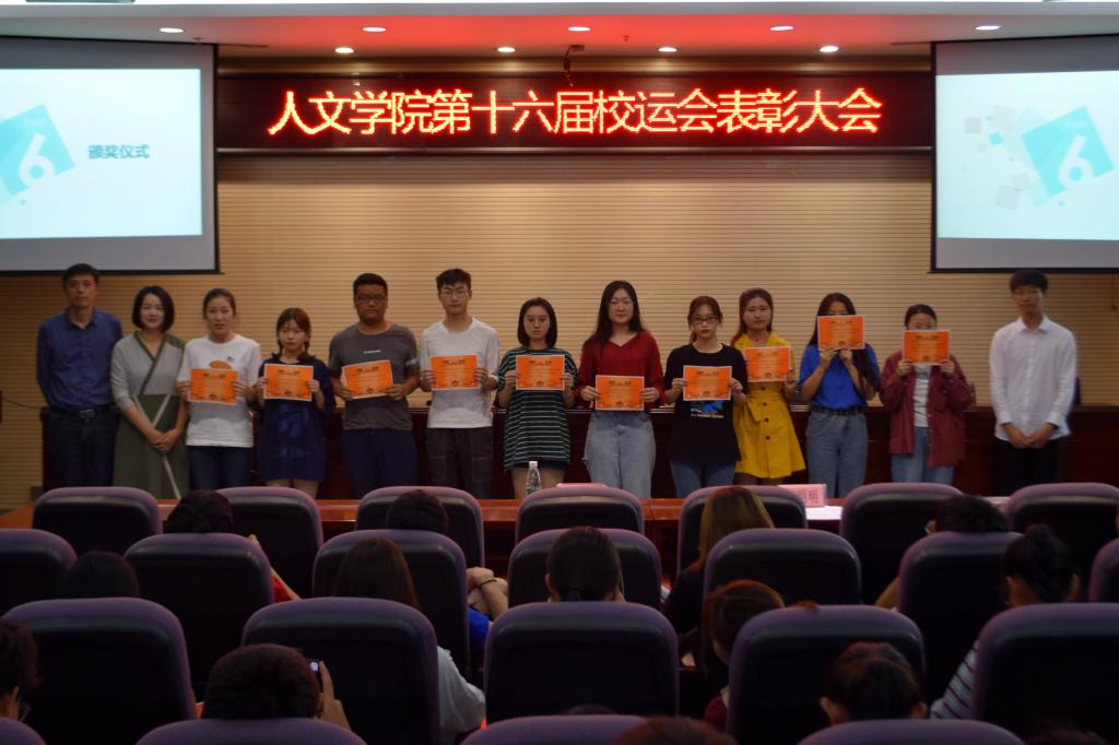 为表彰运动会先进个人 ,传承人文奋勇拼搏精神,5月22日下午14:00,人文学院在图书馆报告厅举办了校第十六届田径运动会表彰大会。人文学院党委副书记周建峰、人文学院团总支书记童明明出席了本次表彰大会,全体学生运动员、广播操代表、团体操代表、啦啦操代表、学生会代表、志愿者代表参加本次表彰大会。