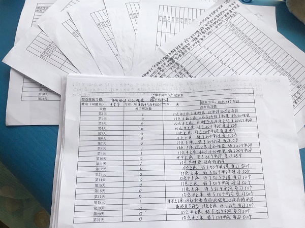 行为决定习惯,习惯决定性格,而性格决定了命运。一个好的行为习惯往往会让你受益匪浅。机电工程学院给报名的900多名同学每人发放了一个紫手环和记录表。参与的同学都写了一个自己想要改变的坏习惯。比如,不抱怨、上课听课不走神、不熬夜等。发现自己没有做到就将手环从一只手腕换到另一只手腕上,并在记录表上记录下一天换手环的次数。