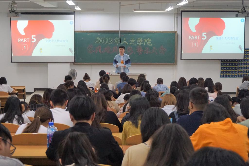 5月30日下午6:30,人文学院在图教楼B205召开了“2019年人文学院学风建设表彰、警示大会”,以此表彰那些在学风建设中表现突出的集体和个人。 人文学院党委副书记周建峰书记、人文学院学工办副主任高欢欢老师、人文学院辅导员汪新老师出席本次大会,各班代表参加大会。