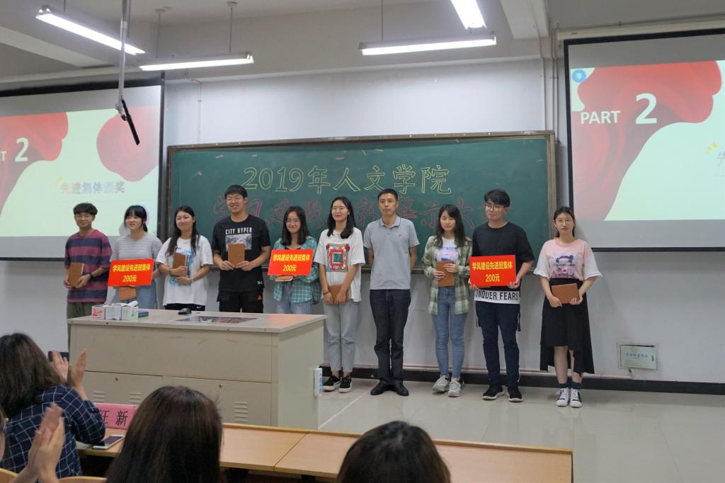 大会伊始,主持人通过视频向大家展示了优秀班级上课时的学风表现,希望同学们能以他们为榜样,共建优良班风。随后,高欢欢老师宣读了《人文学院关于表彰学风建设先进集体及先进个人的决定》,并与与会领导和老师一同为先进班集体和先进个人颁奖。来自18汉语国际教育(2)班范晓霜同学作为学风先进集体代表、17汉语国际教育(1)班郭韵怡同学和16秘书学陈锐同学作为学风先进个人代表分别上台发言。他们分别从班级和个人如何规范上课行为,做好学习规划展开了分享交流。