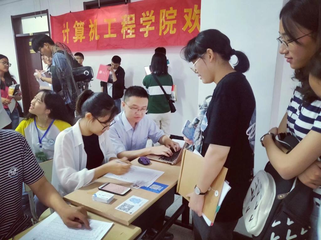 金秋九月,秋高气爽,又是一年迎新时。9月7日计算机工程学院在大学生活动中心喜迎2019级新生入学报到。学院党委书记陈冠亚、院长朱勇、党委副书记陈莉莉、副院长徐永华深入迎新现场,辅导员李华婷老师、张晓雪老师、19级新生班主任、班助及全体志愿者在现场热情迎接新生到来。