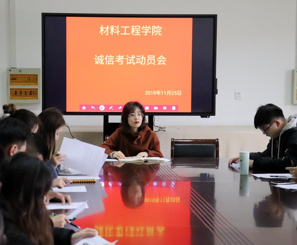 为了响应学校践行社会主义核心价值观活动的号召,促学风严考风,11月25日中午13:15,材料工程学院在工科楼会议室召开诚信考试动员会。此次动员会由材料工程学院辅导员王亚男担任主讲,各班班长参加本次会议。