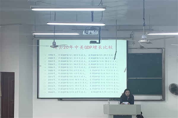 12月11日下午3点,马克思主义学院副教授董娜老师在6300教室为艺术学院的同学们带了一场精彩的中美贸易战本质及其应对的形势政策讲座。