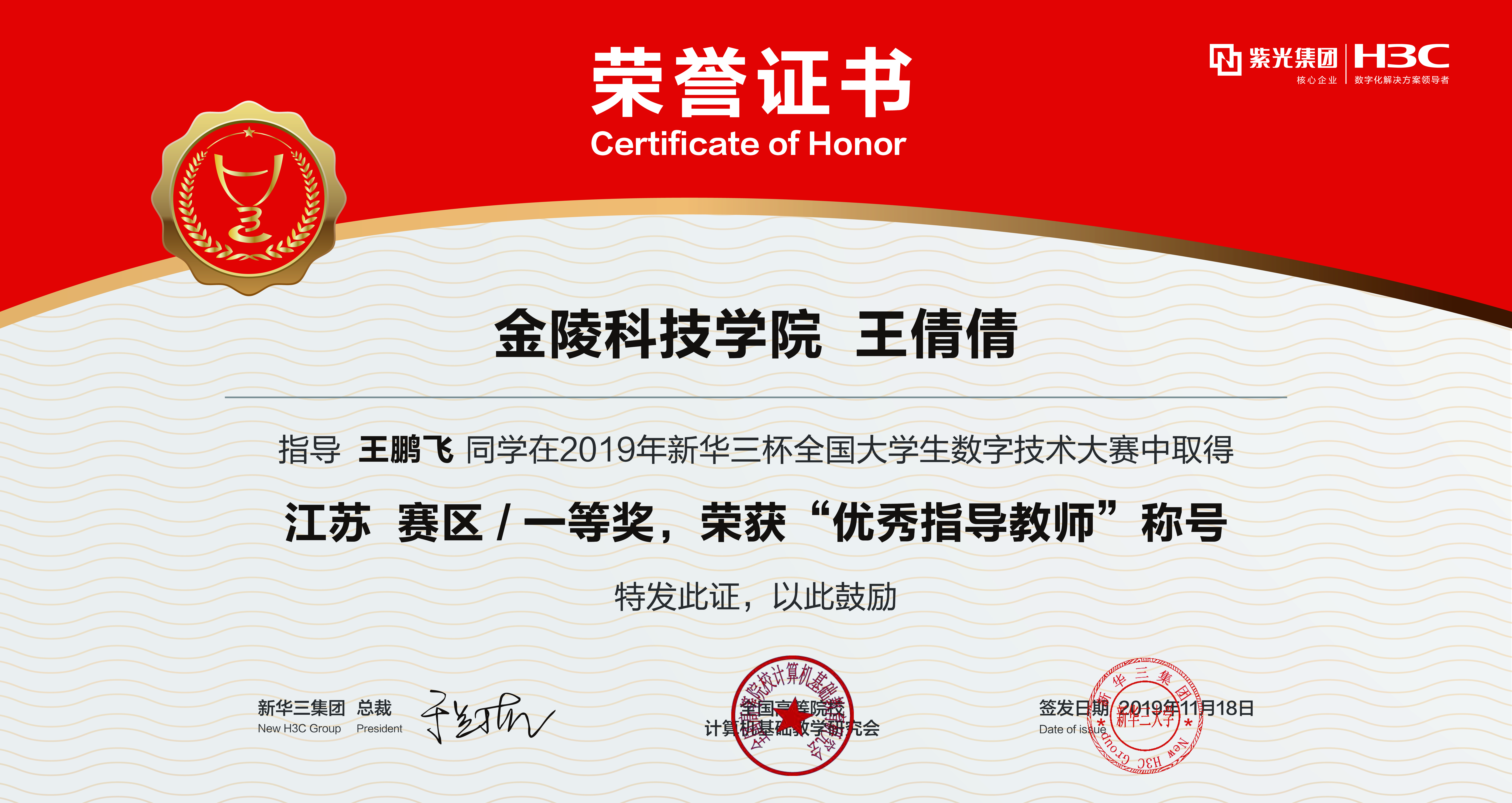 迄今为止,“新华三杯”大赛已成功举办八届,累计有3000余所院校近23000余人参与比赛。在紧张的赛场气氛里,我院参赛选手们全神贯注地进行着答题,经过初赛的角逐我院五名选手脱颖而出。来自16数字出版(2)班朱旻、17数字出版(2)班王鹏飞获得了一等奖,16数字出版(1)班杨开杰、朱烨、严瑞三位同学获得了二等奖的好成绩。数字出版专业王倩倩老师荣获优秀指导老师荣誉称号。