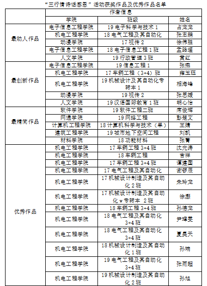 4月7日,由校心理中心主办,机电工程学院和电子信息工程学院联合承办的“三行情诗话感恩”活动顺利结束。此次活动共收到作品500多篇,经评选,最终确定了15份最动人、最创新、最精简获奖作品以及34份优秀作品。具体名单如下: