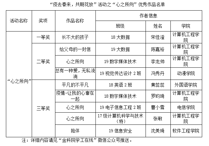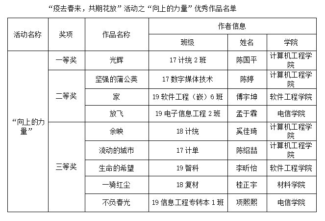 4月8日,由校心理中心主办,计算机工程学院与软件工程学院联合承办的“疫去春来,共期花放”优秀作品征集活动顺利结束,各学院学生踊跃投稿,共收获160份作品,经网络投票评选出优秀获奖摄影作品9份,文字作品9份。具体优秀作品如下: