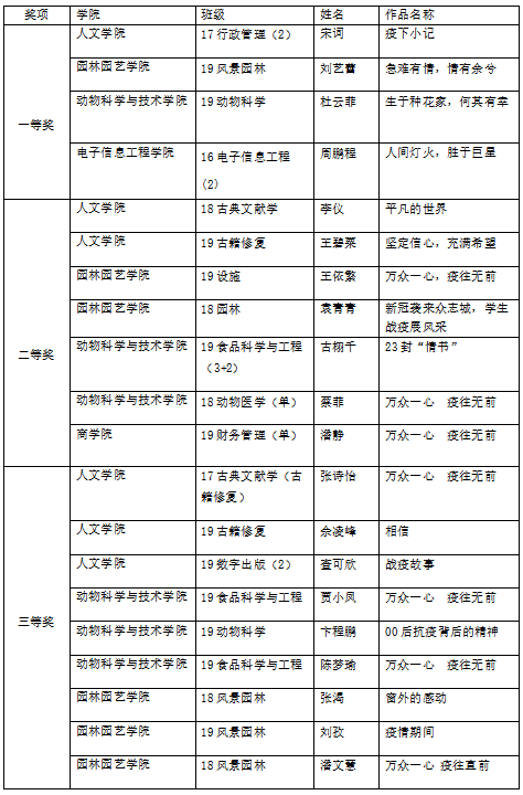 5月30日,由校心理中心主办,人文学院、园艺园林学院以及动物科学与技术学院联合举办的“万众一心,疫往无前”线上征文活动顺利结束,各学院学生踊跃投稿,累计收到65份学生作品,经评选出一等奖4名、二等奖7名、三等奖9名。具体优秀作品如下: