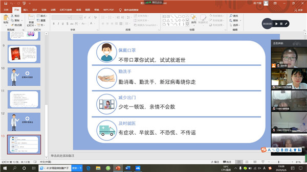 线上主题团日活动由各班级团支书主持,形式多样,通过宣传抗疫一线医护人员先进事迹、讲述防疫知识、抗疫故事、人生感悟,引导学生坚定“四个自信”,激发学生对社会的责任感和热切的爱国之情。我院各班同学积极参与,采取演讲、视频介绍等方式举召开了主题班会,例如18财务管理的学生通过播放短片形式系统科学地介绍了新型冠状病毒,辟谣疫情中的不实信息,号召同学们科学应对疫情,积极做好防疫工作;18审计学的学生通过播放PPT的形式科普了防疫小知识,并进行与疫情相关的知识竞答,消除了学生因对新冠疫情了解不足而产生的的恐惧心理,掌握了关于新冠病毒的科学理论知识,培养了科学防护能力;19会计学(2)班的学生在会上介绍了一些为抗疫做出杰出贡献的优秀典范,分享了战“疫”先锋的感人事迹,向奔赴全国各地抗疫的医生护士、志愿者们致敬,营造了浓厚的抗疫氛围。各班以线上主题团日活动为契机,增强了同学们的家国情怀和民族自豪感。