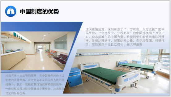 本次主题班会充分展示了我国疫情防控成效,增强了我院学生科学防护知识和能力,使他们深刻认识到中国特色社会主义制度优越性,激发了我院学生爱党爱社会主义的热情。(审核人:王艳成)