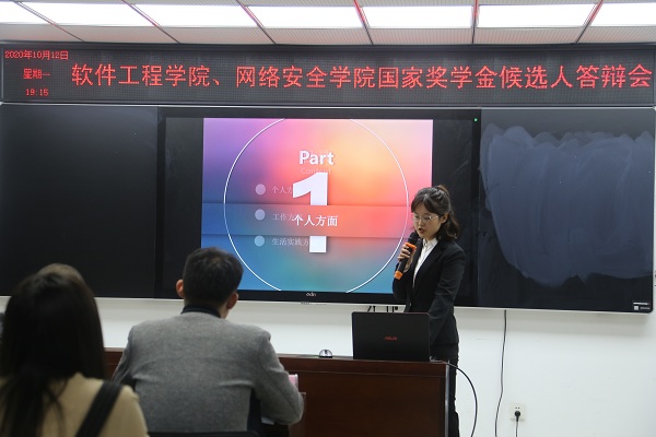 为激励学生勤奋学习、努力进取,在德、智、体、美、劳等方面全面发展,10月12日晚上18时30分,软件工程学院、网络安全学院在科技楼2号楼423报告厅举办国家奖学金候选人答辩会。参加本次会议的有学院党委副书记徐斌、学工处资助中心副主任曹轶蕾和相关辅导员,各个班级的学生代表近60人参加。