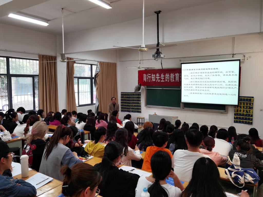 传承行知精神,致敬大教育家陶行知先生。11月18日下午2:30,人文学院在教学楼二阶举办了“陶行知教育理想”主题讲座。本次讲座与我院党委共建单位中共南京晓庄学院机关党委第十九支部联合开展,特邀南京晓庄学院《生活教育》月刊编辑、副教授王文岭老师主讲。陶行知纪念馆副馆长马仕锦、我院党委副书记周建峰、学工办主任童明明,与2020级汉语国际教育专业学生参加了本次讲座。