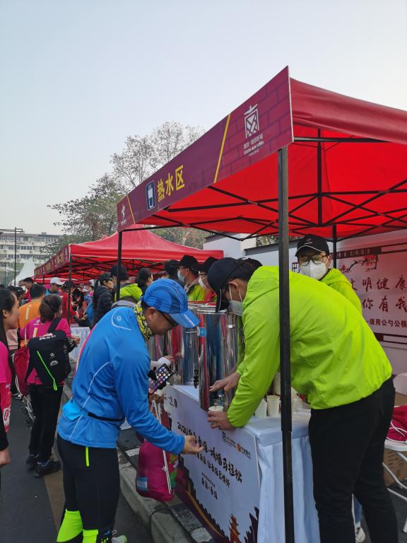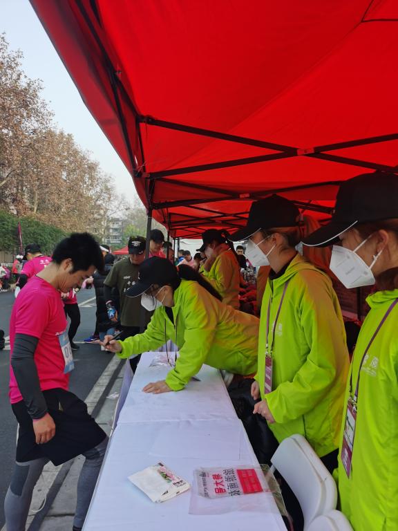 志愿招募期间,同学们报名十分积极踊跃,在短短一天时间内,报名人数突破180多人,最终经过筛选160名志愿者入围,进行了服务技能的培训,并到现场进行了相关服务点的全要素演练。赛事期间,志愿者们承担了在起终点存取包、完赛物品发放区、奖牌发放区、赛道补给点、选手拉伸区等二十多个岗位的服务。当天凌晨5:30志愿者们准时到达指定区域,开始了赛前的准备工作。一丝不苟地按照演练要求,为选手提供周到服务。从入口处参赛凭证的检查,到热水补给品的搬运,再到嘉宾区的服务,志愿者们认真负责的态度,温暖热情的笑容感染着现场每一个人,赢得了组委会和运动员的认可!