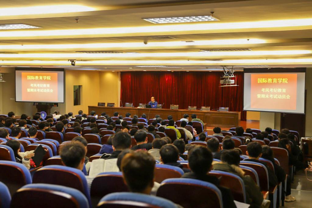 临近期末,各门课程考试逐步进行,为加强考风考纪教育,加强学风建设常态化管理,增强学生诚信意识,营造良好学习氛围,国际教育学院于12月9日晚在图书馆第二报告厅开展考风考纪教育暨期末考试动员大会。本次教育大会由国际教育学院党总支部副书记郑庆秋主讲,学院2020级全体学生参加。